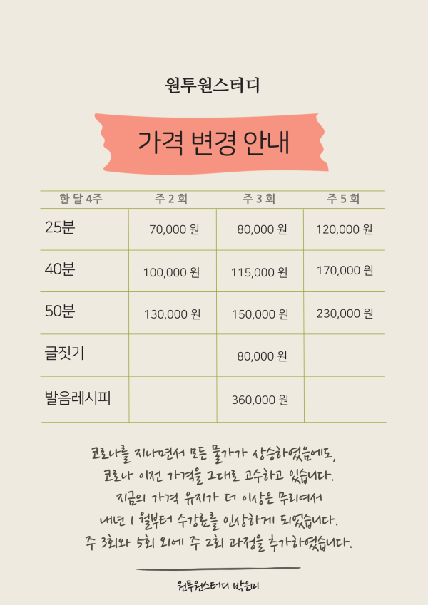 코로나를 지나면서 모든 물가가 상승하였음에도, 원투원스터디는 이전 가격을 그래로 고수해 오고 있습니다. 지금의 가격 유지가 더 이상은 무리여서 내년, 2024년 1월 부터 수강료를 인상하게 되었습니다. 또 주 3회와 5회 수업 외에 주 2회 과정을 추가하였습니다.