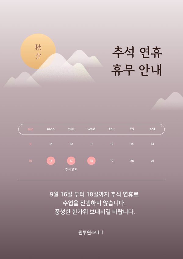 목록 추석 연휴 안내입니다 페이지 정보 작성자 관리자(118.34.135.138) 댓글 0건 조회 937회 작성일 24-09-10 본문 9월 16일부터 18일까지 추석 연휴로 수업이 진행되지 않습니다. 오고 가는 길 안전하고 즐거운 명절 되세요. 이전글 구정 연휴 안내입니다 25.01.22 목록 다음글 Set Menu, 쎄트 메뉴 출시합니다. 23.12.19